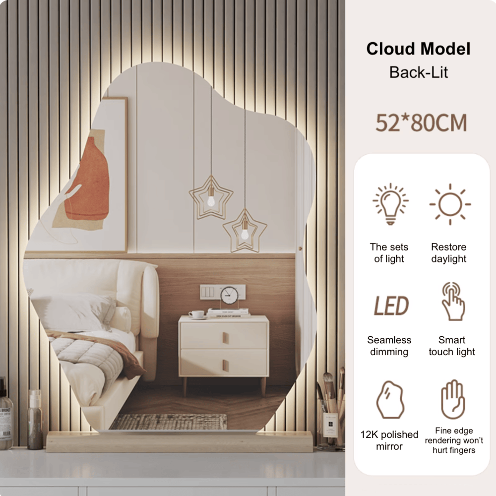 This uniquely shaped mirror consists of back lit illumination, making it perfect for both practical use and aesthetic enhancement. Its cloud-inspired design adds a touch of softness and creativity to your room décor, ensuring it stands out as a conversation starter. It is light-weight which allows for easy wall mounting.